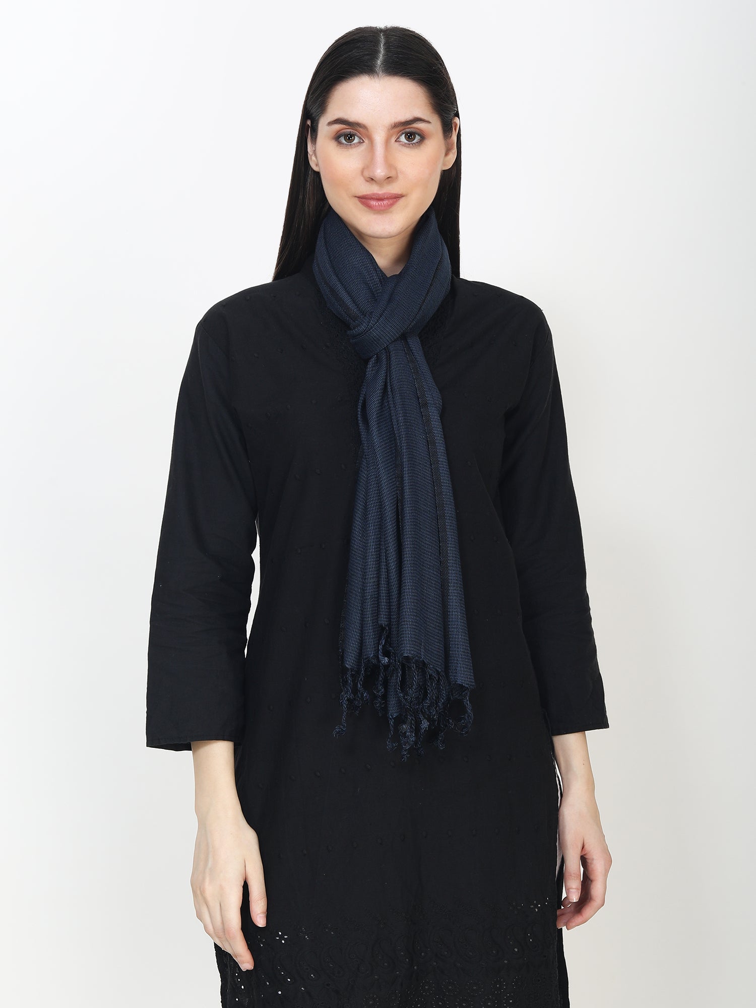 This dark blue cotton stole is handwoven in Bhagalpur using traditional looms. The woven design adds subtle texture while keeping the stole lightweight and breathable, making it suitable for regular, all-day use.